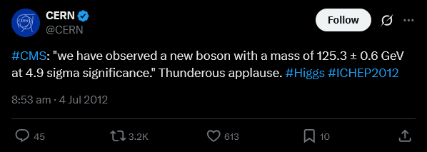 One morning, just outside Geneva, Switzerland, a group of scientists gathered, awaiting the presentation of the first results from the newly built Large Hadron Collider. The suspense was palpable, the atmosphere thick with the anticipation of a breakthrough. Scientists from all over the world followed the event both in person and online. Joe Incandela and Fabiola Gianotti, spokespeople for the European Organisation for Nuclear Research (CERN), gave long presentations, culminating in one simple phrase: ‘we have it’. The crowd erupted and tears of joy were shed. That morning, CERN had officially confirmed the discovery of the Higgs boson and spread the news of their success via social media.
