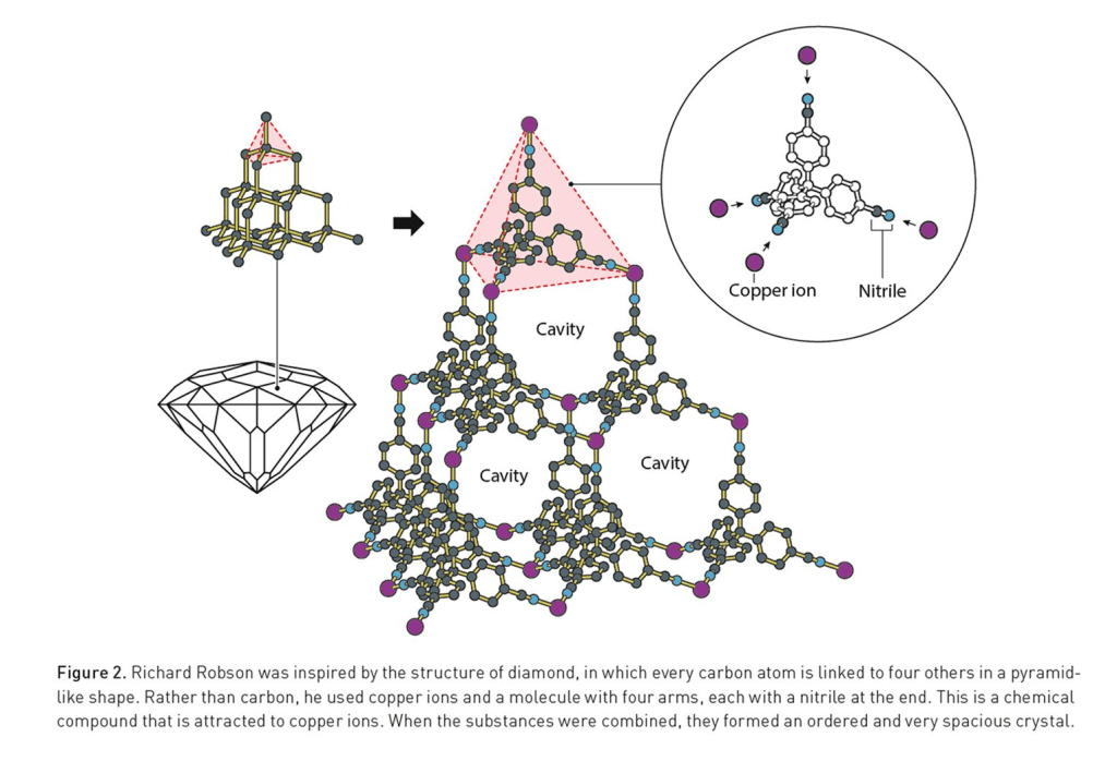 It all started in 1974, when Robson was building models of crystalline structures for chemistry students at the University of Melbourne. ‘As I was constructing these models – putting metal rods of clearly defined dimensions into wooden balls with accurately drilled holes – the thought arose: what if we used molecules in place of the balls and chemical bonds in place of the rods?’ he told Adam Smith on October 8th [1.]. In 1989, he combined positively charged copper ions with a four armed molecule, which allowed for the formation of an organised crystal structure similar to diamond, filled with many, many pores, as stated in the Nobel Prize Press Release [2.]. Although Robson’s creation was unstable, it was the beginning of a new and promising field of chemistry.