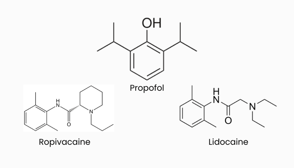 Lidocaine is a widely used local anaesthetic agent. It contains an aromatic ring, a structure that allows the drug to permeate through the lipophilic cellular membrane. The hydrophilic amino group contributes to the molecule’s solubility in water. Unlike propofol, lidocaine applies its anaesthetic mechanism on the peripheral nervous system (PNS) as well as the CNS by diffusing through the lipophilic cellular membrane and binding to the voltage-gated sodium channel from the intracellular side.The reversible binding of the lidocaine to the presynaptic neuron inhibits the influx of sodium ions through the channel. This prevents the propagation of an action potential along the nerve. Lidocaine is initially metabolised in the liver where the alkyl groups are removed from the amine. The amide is then more readily hydrolysed to produce the desired metabolites.